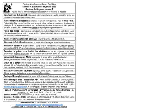 Rassemblement diocésain ce dimanche 11 janvier. Notre paroisse à RDV de 10h à 11h30 à l’église Saint-Géry : accueil convivial, puis temps de prière, partage et chants puis témoignage de néophytes. À 12h, « pique-nique tiré du sac » au Palais des Grottes et jeux anciens. À 14h : spectacle sur la vie de Saint Géry ; à 15h messe (unique) puis partage de la galette des Rois.
