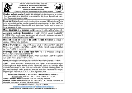 Octobre, mois du rosaire. Chapelet : à la cathédrale le lundi et du mercredi au vendredi à 18h et le samedi à 9h30. À Saint-Martin le mercredi à 10h. À la clinique Sainte-Marie le mardi à 18h. À Saint-Joseph le vendredi à 18h.