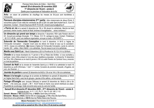 Chorale de la messe diocésaine du 11 janvier à 15h au Palais des Grottes : si vous souhaitez y participer, merci d’être présent à l'une des deux répétitions proposées : le dimanche 14 décembre de 15h à 18h à Raismes ou le mardi 6 janvier à 19h à la salle Fénelon de Cambrai Vous y recevrez un livret de partitions.
