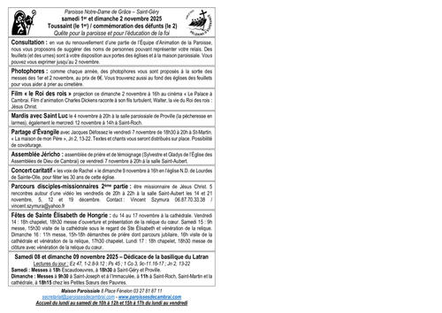 Photophores : comme chaque année, des photophores vous serons proposées à la sortie des messes des 25 et 26 octobre et 1er et 2 novembre, au prix de 6€. Vous trouverez aussi au fond des églises des feuillets pour vous aider à prier au cimetière.