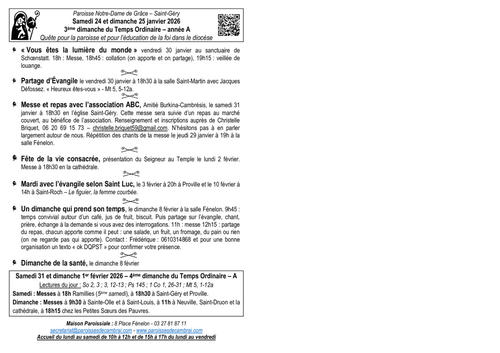 - Messe et repas avec l’association ABC, Amitié Burkina-Cambrésis, le samedi 31 janvier à 18h30 en l’église Saint-Géry. Cette messe sera suivie d’un repas au marché couvert, au bénéfice de l’association. Renseignement et inscriptions auprès de Christelle Briquet, 06 20 69 15 73 – christelle.briquet59@gmail.com. N’hésitons pas à en parler largement autour de nous. Répétition des chants de la messe le jeudi 29 janvier à 19h à la salle Fénelon.