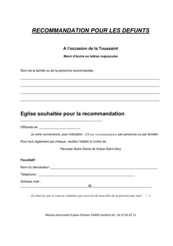 Si vous voulez recommander vos défunts (personne ou famille) lors d'une messe prévue à cet effet les samedi 1er et dimanche 2 novembre 2025 vous pouvez utiliser le formulaire téléchargeable ci-dessous et le déposer avec son offrande (2€) à la maison paroissiale. Pour voir les horaires et les lieux des offices, cliquer ici