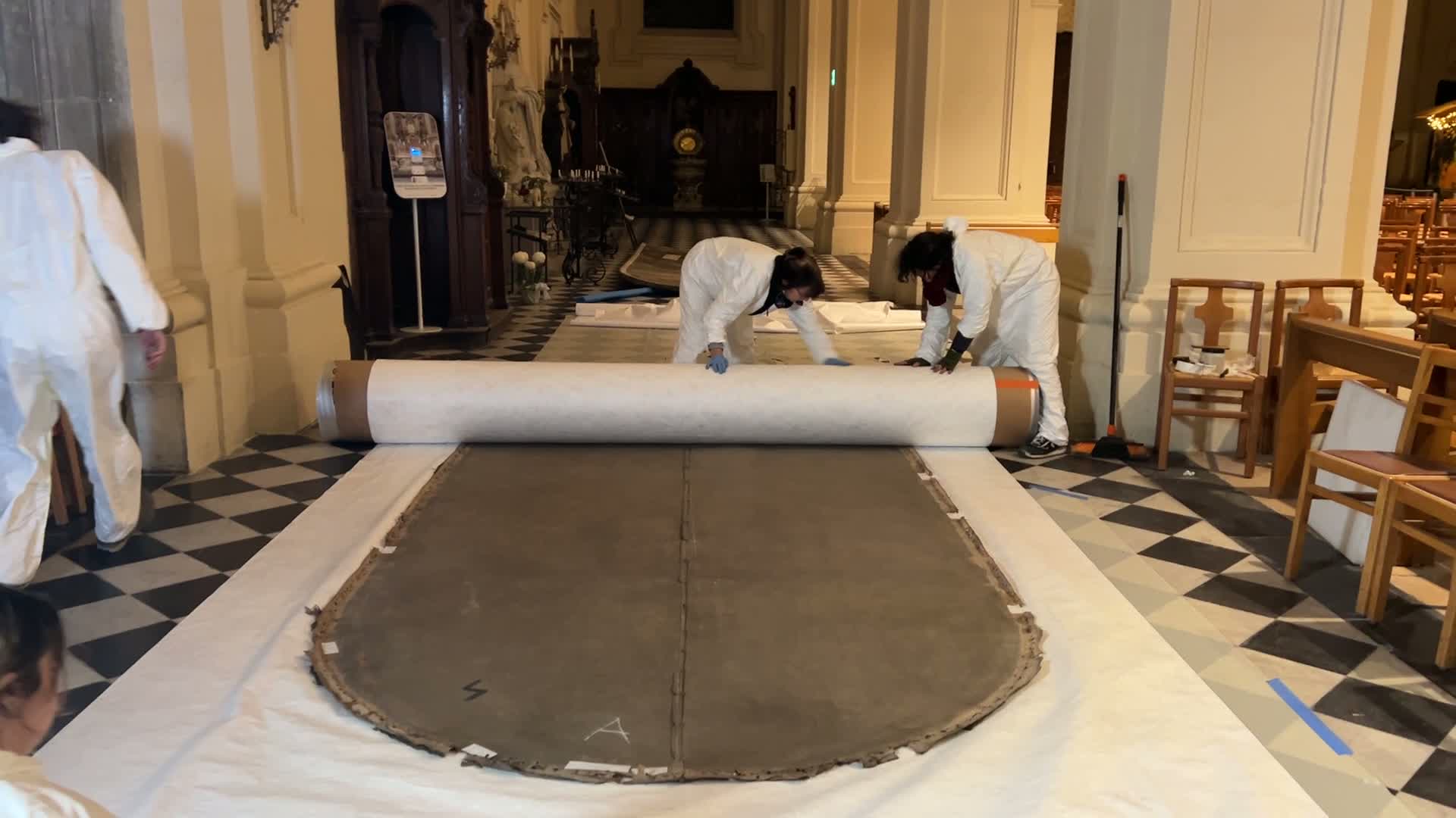 Les photos et la vidéo donnent un aperçu des préparatifs des grisailles pour leur transport vers un atelier de restaurartion de Vesoul.